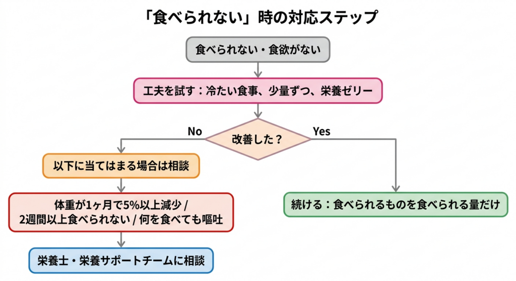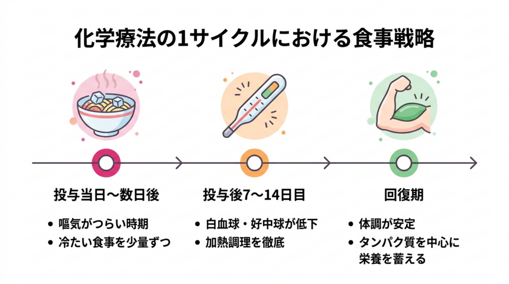 大まかに分けると、投与当日から数日間は吐き気が強く出る場合がありますが、その際は冷たくのど越しのよいものを少量ずつ食べるのが基本です。投与後7〜14日目は白血球が最も低下する時期であることが多く、加熱した料理を優先的にとっていただき、食品衛生への注意が必要です。そして回復期(次のサイクルまで)は体調が安定してくるため、タンパク質を中心に栄養を蓄える大切な期間になります。