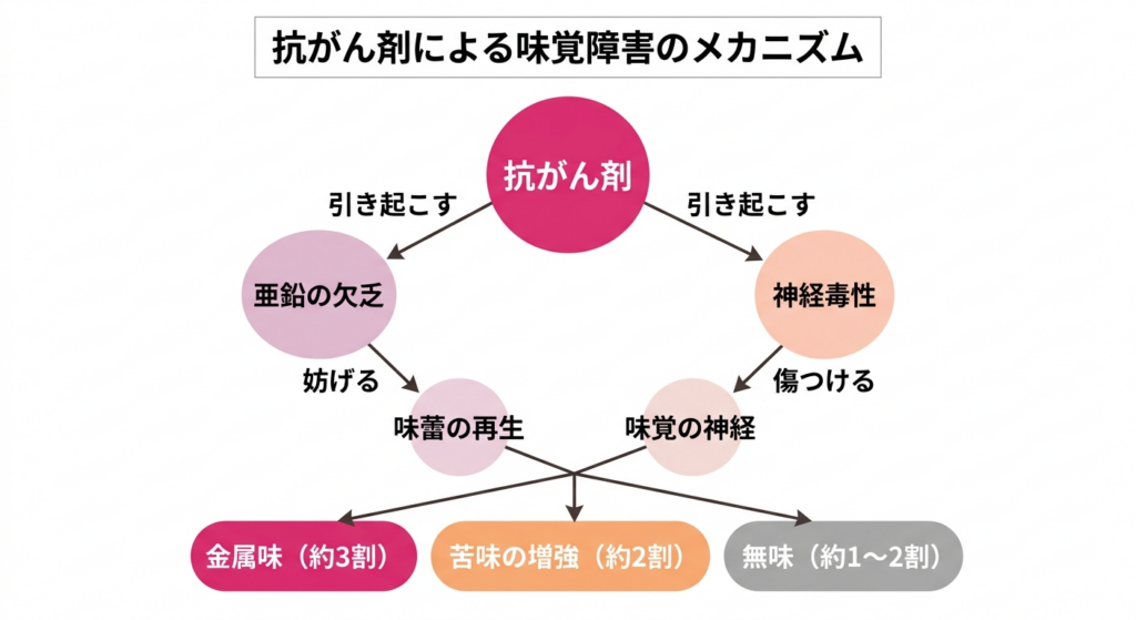 - 亜鉛の欠乏体内の亜鉛という栄養素が不足した状態です。亜鉛は味蕾細胞の健康を保つのに必要で、不足するとしっかり味を感じられなくなることがあります。: 多くの抗がん剤は体内の亜鉛代謝に影響を及ぼします。亜鉛が不足すると味蕾細胞の正常な再生新しい細胞が生まれ、古い細胞と入れ替わることです。味蕾細胞は約10~14日のサイクルで再生していますが、抗がん剤の影響を受けるとこのプロセスが妨げられます。が妨げられます