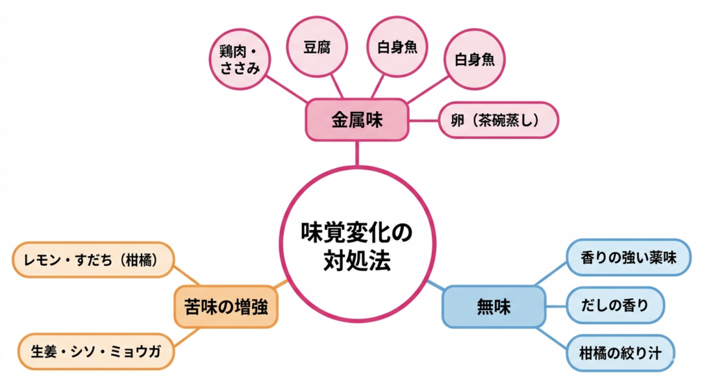 この二つが単独あるいは複合的に作用して、さまざまなパターンの味覚変化が生じます。