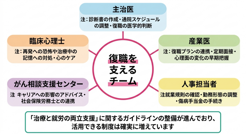 身体の回復に意識が向きがちですが、がん治療を経験したことによる心理的な負担は見過ごせません。職場復帰後にふとした瞬間に治療中の記憶がよみがえったり、再発への恐怖で仕事に集中できなくなったりする方は一定数いらっしゃいます。こうした反応は異常なことではなく、大きなストレスを経験した後の自然な心の動きです。産業医との定期面接はこうした心理面の変化を早期にとらえる貴重な機会ですので、ぜひ活用してください。産業医から主治医や臨床心理士心理学の知識と技術を使って、心の悩みやストレスに対応する専門家です。がん治療を経験した後の不安や恐怖心などの心理的な問題をサポートします。→ 乳がんを経験したあとの人生をどう歩むか——心の回復と新たな自分を見つけるまでへの連携もスムーズに行えますし、必要に応じて心療内科体と心の両面から治療を行う医療科です。がん治療後に生じた心理的な負担が体の症状に影響している場合、その対応を専門とします。→ 乳がんを経験したあとの人生をどう歩むか——心の回復と新たな自分を見つけるまでへのご紹介も可能です。