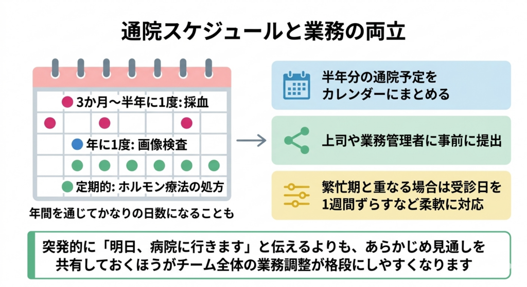 乳がんの手術後もホルモン療法女性ホルモンの働きを弱める薬を使う治療方法です。ホルモンに反応するタイプの乳がんの再発を防ぐために、手術後に数年間続けられることが多いです。や定期検査で通院が続きます。3か月や半年に1度の採血腕の血管から少量の血液を採取し、血液の成分を調べることで、体の状態が良好かどうかを確認する検査です。治療後の経過観察に定期的に行われます。、年に1度の画像検査X線やCT、MRIなどの機器を使って、体の内部を映像で見る検査です。治療後のがんの再発がないかを確認するために年1回程度行われます。、そしてホルモン療法の処方のための受診など、通院頻度は人によって異なりますが、年間を通じてかなりの日数になることも珍しくありません。ここで大切なのは、復職前の段階で向こう半年分程度の通院予定をカレンダーにまとめ、上司や業務管理者に提出しておくことです。