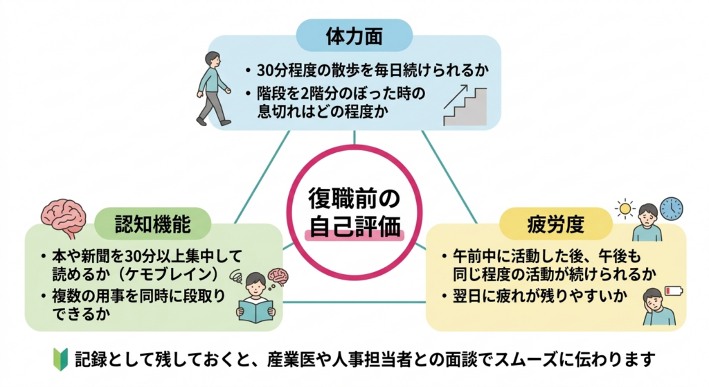 復職の日程を決める前に、ご自身の状態を客観的に把握しておくことがとても大切です。一つの方法として、患者さんに3つの軸で自己評価をしていただくことがあります。ひとつ目は体力面で、「30分程度の散歩を週5日続けられるか」「階段を2階分のぼったときの息切れはどの程度か」といった日常生活の動作を基準にします。ふたつ目は認知機能記憶力、集中力、判断力、理解力など、頭を使って考えたり判断したりする能力全般のことです。がん治療後はこれらの機能に一時的な影響が出ることもあります。で、化学療法後に「ケモブレイン化学療法を受けた後に、集中力や記憶力が低下する状態のことです。『抗がん剤脳症』とも呼ばれ、治療後に認知機能に一時的な影響が出ることがあります。→ 化学療法後の「頭にモヤがかかる」感覚――ケモブレインとうつ症状が重なるとき」と呼ばれる集中力や記憶力の低下を感じる方がいますので、「本や新聞を30分以上集中して読めるか」「複数の用事を同時に段取りできるか」を確認します。そして3つ目が疲労度で、「午前中に活動した後、午後も同じ程度の活動が続けられるか」「翌日に疲れが残りやすいか」を振り返ります。